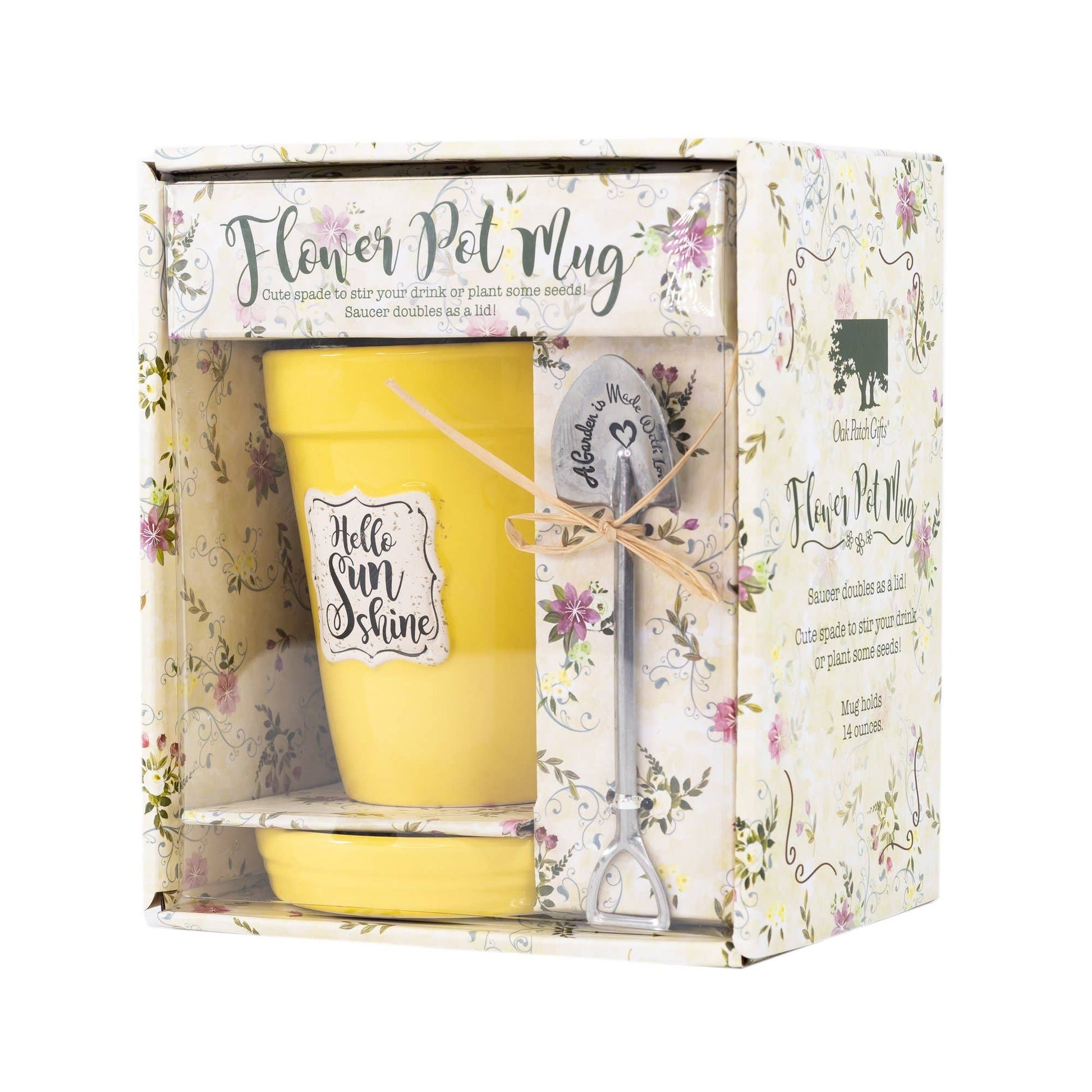 Our Flower Pot Mugs are customer favorites! Mugs come packaged in a cute gift box measuring 6.625" x 7.5" x 4.625" and contain a mug, saucer and spoon. Mugs are 4.625" tall, hold 14 oz. and feature an uplifting message. Coordinating saucer doubles as a lid to keep your drink warm. Stainless steel garden spade spoon is 5.5" x 1.375" and features engraving "A Garden is Made with Love. Dishwasher and microwave safe.
